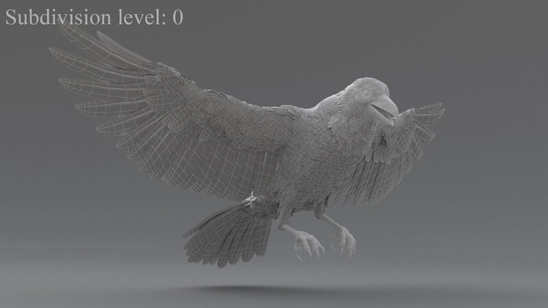 Our Raven model has V-Ray material with high resolution textures. This Raven model has clean topology and is good in one iteration of smoothing.