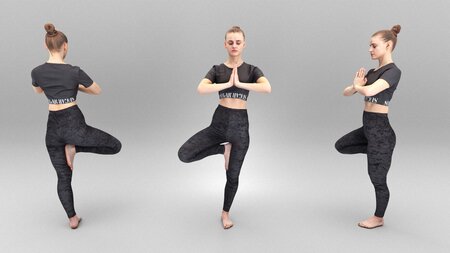 This is a true human size and detailed model of a sporty beautiful woman of Caucasian appearance dressed in sportswear. The model is captured in casual pose to be perfectly matching various architectural and product visualizations, as a background or mid-sized character on a sports ground, gym, beach, park, VR/AR content, etc.