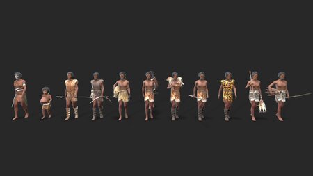 MAX2016 file, V-Ray materials, BIP skeleton, walking animation, TurboSmooth modifier, renderable. Maya2020 file, Arnold materials, rigging, walking animation. C4D file, default materials, rigging, walking animation. Special Note: hominidall.ZIP contains all the character models combined. The compressed files hominidMAX/hominidC4D/hominidFBX/hominidMAYA0-10 are individual model files for characters 0-10.