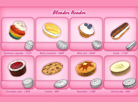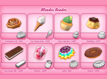 Items (polygons): - Apple pie (176P) - Banana split (545P) - Birthday cake (273P) - Brownie (22P) - Cake (144P) - Cannoli (124P) - Cheesecake (80P) - Cherry pie (160P) - Chocolate cake(144P) - Chocolate mousse (274P) - Chocolate tart (128P) - Cinnamon roll (96P) - Cookie (48P) - Cotton candy (192P) - Crumble (200P) - Danish (98P) - Donut (192P) - Eclair (174P) - Fruit skewer (286P) - Ice cream cone (132P) - Ice cream sandwich (126P) - Ice cream treat (250P) - Jello (96P) - Jelly roll (32P) - Keylime pie (242P) - Lime cupcake (148P) - Macarone (132P) - Mega cone (289P) - Melon salad (238P) - Melty moment (180P) - Meringue (60P) - Milkshake (327P) - Mini tart (204P) - Pancakes (138P) - Panna cotta (88P) - Parfait (184P) - Peach cobbler (180P) - Pink cupcake (156P) - Popsicle (100P) - Pound cake (160P) - Pudding (107P) - Rainbow cupcake (132P) - Red velvet cake (400P) - Strawberry shortcake (228P) - Sundae (312P) - Tiramisu cake (174P) - Trifle (304P) - Waffle (128P) - Wedding cake (352P) - Whoopie pie (156P)