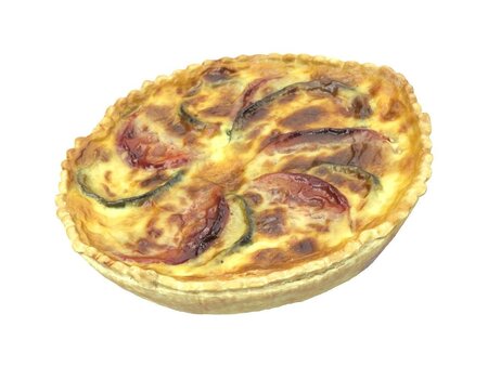 Highly detailed, photorealistic, 3d scanned model of a tomato zucchini quiche. 8k textures maps, optimized topology and uv unwrapped.