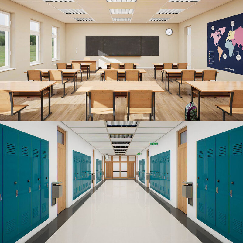 A SET OF 2 INDIVIDUAL UNREAL ENGINE UE4 SCHOOL / COLLEGE / UNIVERSITY SCENES - HALLWAY AND CLASSROOM: