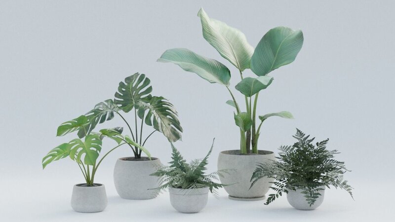 A pot plant pack contained inside 2 type of fern plant, 1 arrowhead plant and 2 monstera plant, contain 512/1024/2048p texture. Total all object tris 17.436