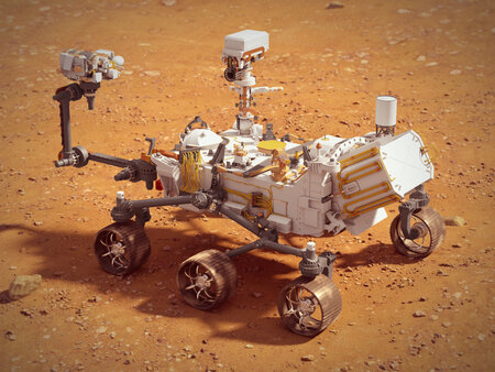 High quality and very detailed 3d model of NASA Perseverance Rover. Scene includes martian surface and crater.